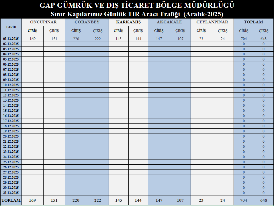 Aralık-2025 Gümrük Kapılarımız Günlük TIR Aracı İstatistiği