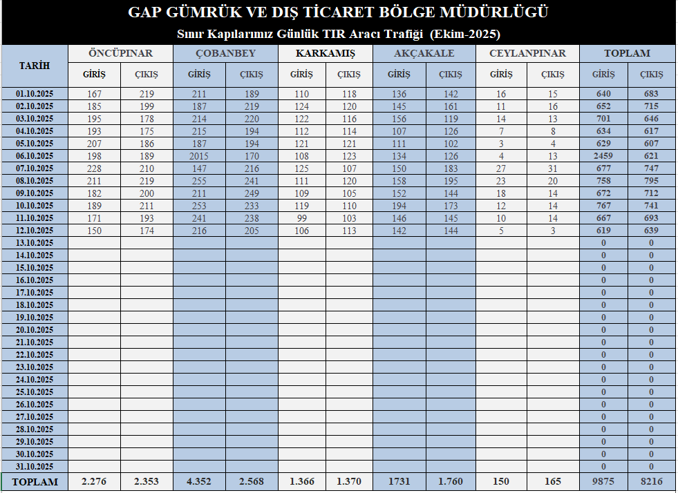 Ekim-2025 Gümrük Kapılarımız Günlük TIR Aracı İstatistiği
