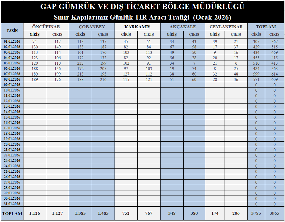 Ocak 2026 Gümrük Kapılarımız Günlük TIR Aracı İstatistiği