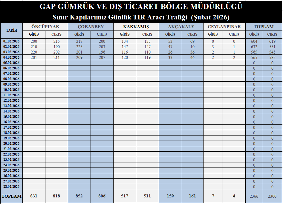 Şubat 2026 Gümrük Kapılarımız Günlük TIR Aracı İstatistiği